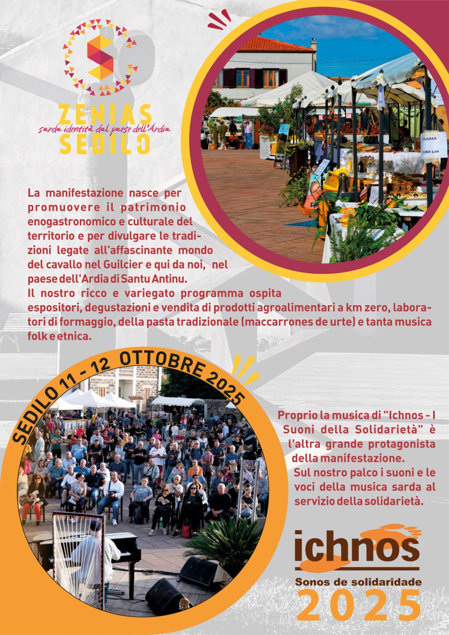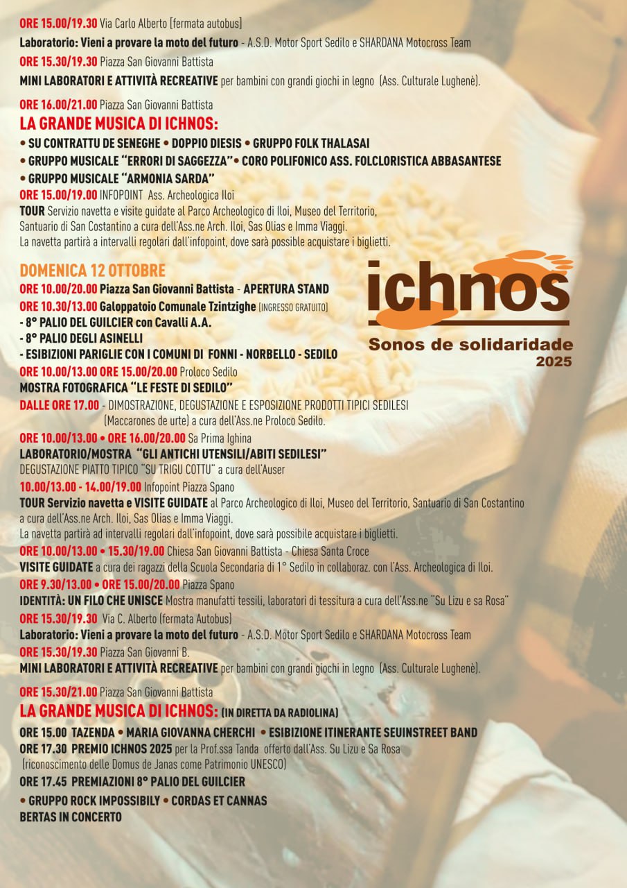 Nel weekend dell'11 e 12 ottobre, torna anche "Ichnos - Sonos de Solidaridade", giunto alla sua 32ᆰ edizione, con musica live, percorsi itineranti di musica tradizionale e concerti. Kermesse che unisce spettacolo e impegno civile, sensibilizzando su temi cruciali come la donazione del sangue, la prevenzione degli incendi boschivi e il contrasto allo spopolamento. Sul palco, tra gli altri, artisti del calibro dei Tazenda, Cordas et Cannas, Maria Giovanna Cherchi, Bertas. (Fonte Unione Sarda)