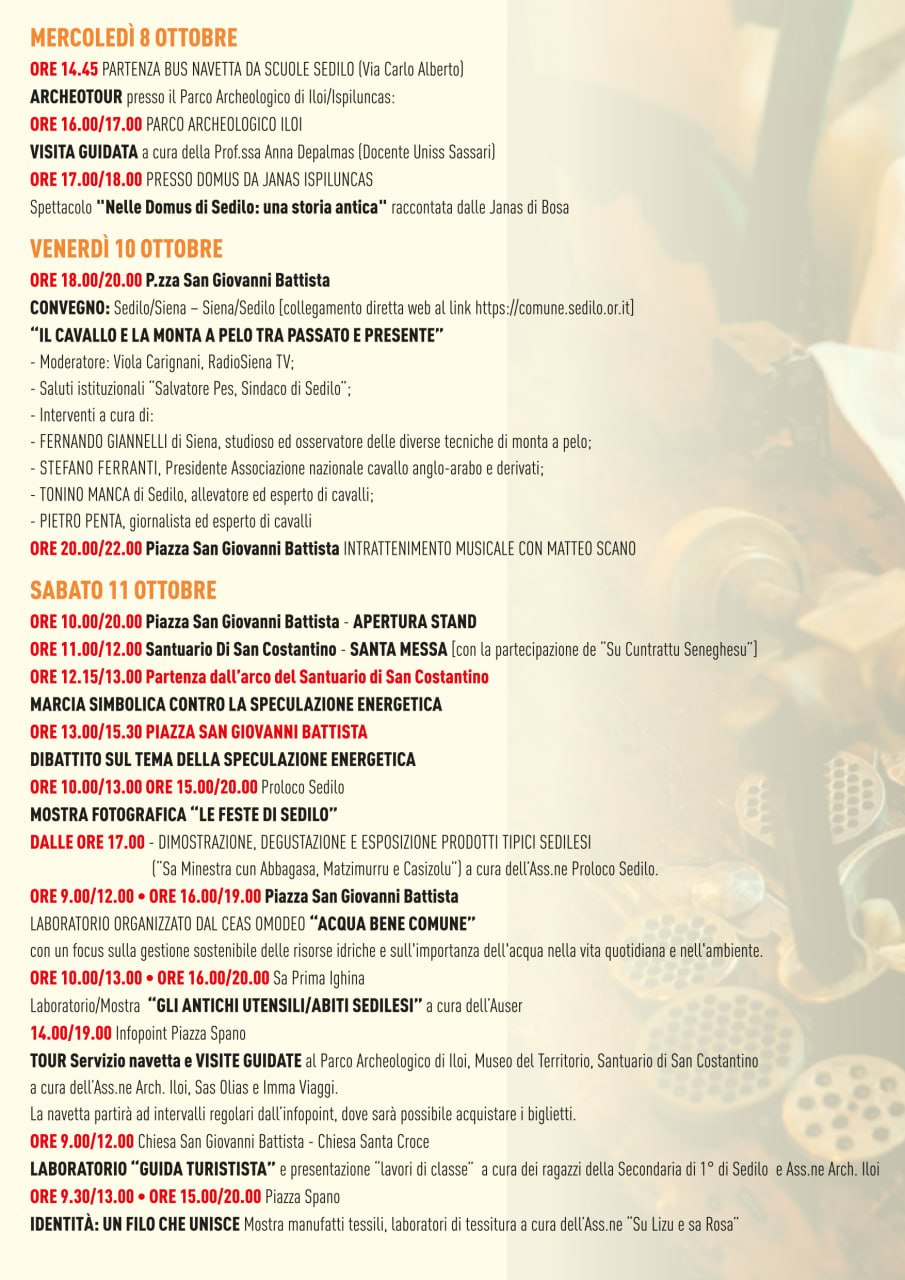 Tra gli appuntamenti più attesi, domenica 12 ottobre, il "Palio del Guilcier" nel galoppatoio comunale, con cavalli anglo-arabi e fantini sardi pronti a regalare emozioni e spettacolo. Mercoledì 8 ottobre sarà la giornata dedicata all'archeologia con l'Archeotour al Parco di Iloi-Ispiluncas. Dalle 14.45 partirà una navetta dal piazzale delle scuole per accompagnare i partecipanti alla visita guidata condotta dalla prof.ssa Anna Depalmas dell'Università di Sassari. A seguire, lo spettacolo "Nelle Domus di Sedilo: Una Storia Antica", raccontata dalle Janas di Bosa, porterà il pubblico in un viaggio emozionale tra mito e memoria.